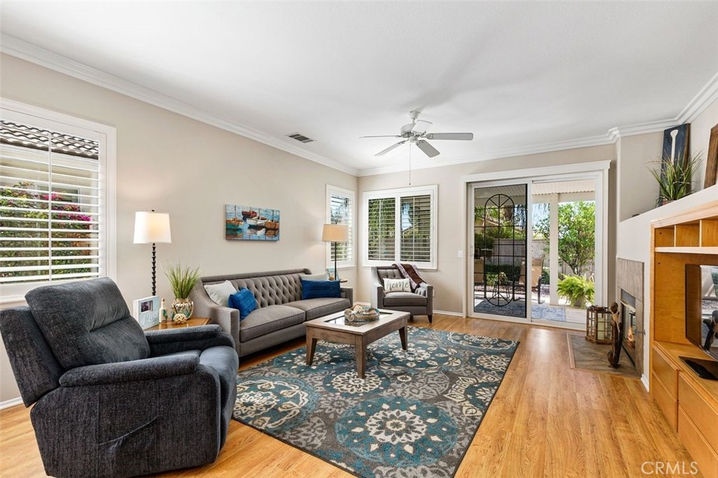 Don’t miss this excellent opportunity to own within The OASIS 55+ Gated Guarded Resort Style community! This charming, popular Delphi Model home is situated conveniently within the community, offering both serenity and privacy, along with comfort and elegance. This highly upgraded home features custom plantation shutters throughout, crown molding, all new fresh paint, an abundance of natural light, and beautiful vinyl laminate floors. As you enter, you are greeted by the spacious living room, seamlessly connected to the dining room which features new carpet, recessed lighting, a crown molded tray ceiling and a beautiful chandelier. These rooms provide a comfortable space for celebrating the holidays, dinner parties, as well as conversation and socializing with family and friends. The kitchen is open and airy, and includes a large, family-sized breakfast island, recessed lighting, a cooktop, a double self cleaning oven, a stainless steel refrigerator, dishwasher, new garbage disposal, desk area and pantry. The open floor plan blends the family room with the kitchen area and includes a media nook, sliding glass door, ceiling fan, and a gas fireplace. Next to the family room you will find both a guest bedroom with a ceiling fan and the master suite. The large master bedroom is complete with a crown molded tray ceiling and ceiling fan. The suite's bathroom is furnished with dual sinks, a walk in shower, spa tub and a spacious walk-in closet. The home is highlighted with a 3rd bedroom, oversized laundry room with a counter folding area, and a 2-car garage. Beyond the family room is a serene, private, relaxing backyard which offers peaceful surroundings to enjoy the fresh air and time with loved ones. The vinyl patio cover is accented with a new ceiling fan and comes with ample lighting and spans the full width of the home. The Oasis in Menifee, is a beautiful active adult community surrounding the 36-hole Menifee Lakes Country Club. The community offers great amenities for the California lifestyle. It is ideally set in the heart of southern California within an hour of both the ocean and the desert. The clubhouse includes a fitness center, grand ballroom with stage, arts and crafts studio, billiard room and library and so much more. Outside, residents enjoy the sunny southern California weather at the pool, on the tennis, bocce ball and shuffleboard courts. Don’t miss this beautiful home!