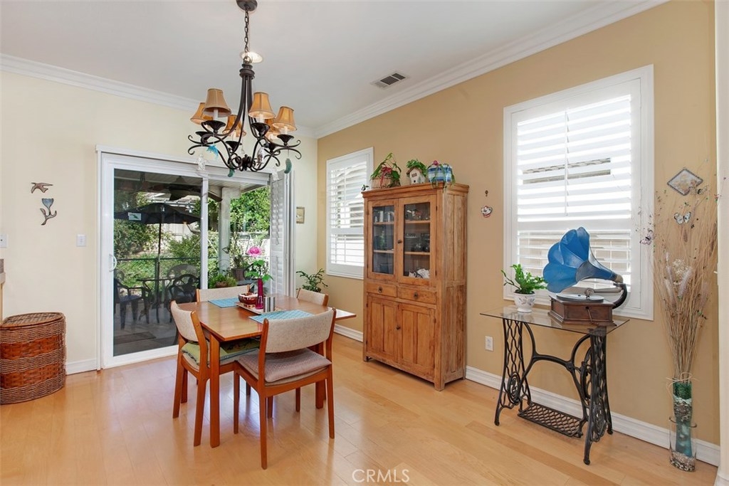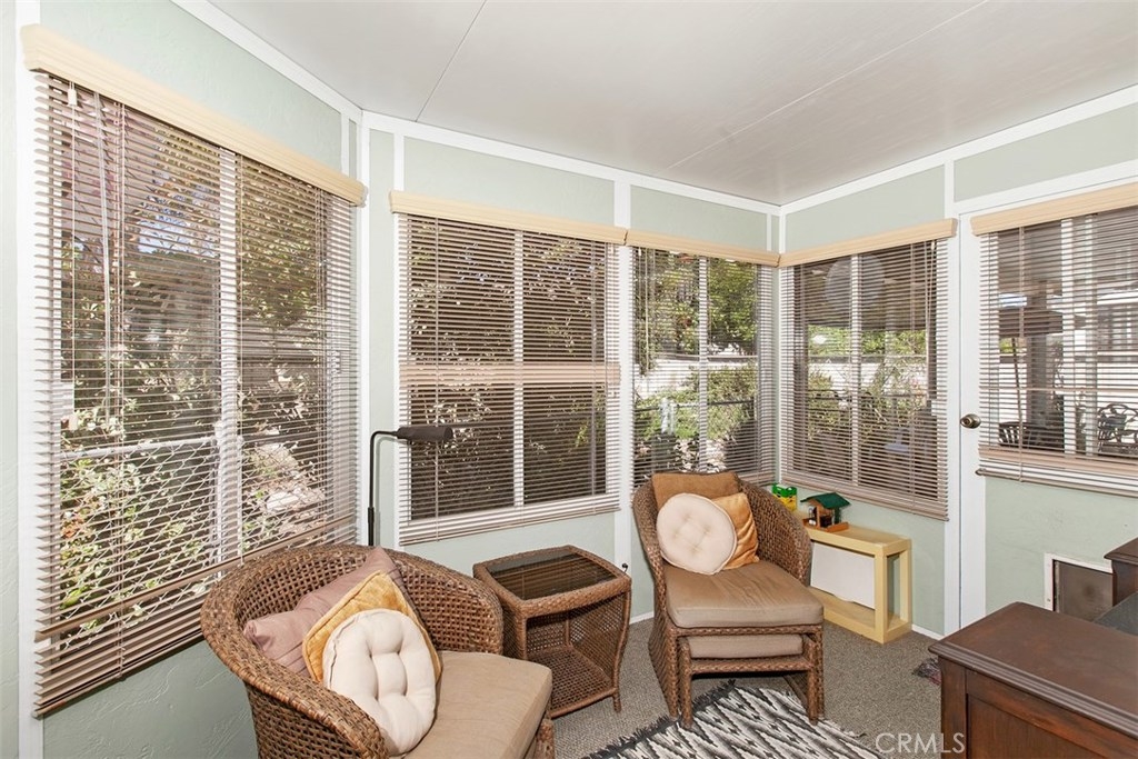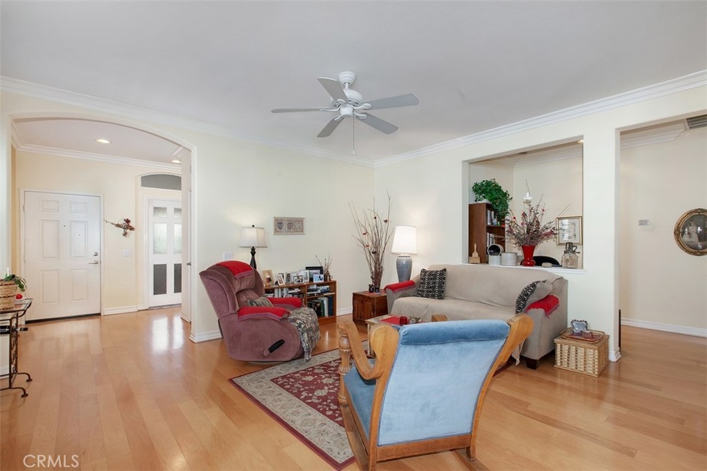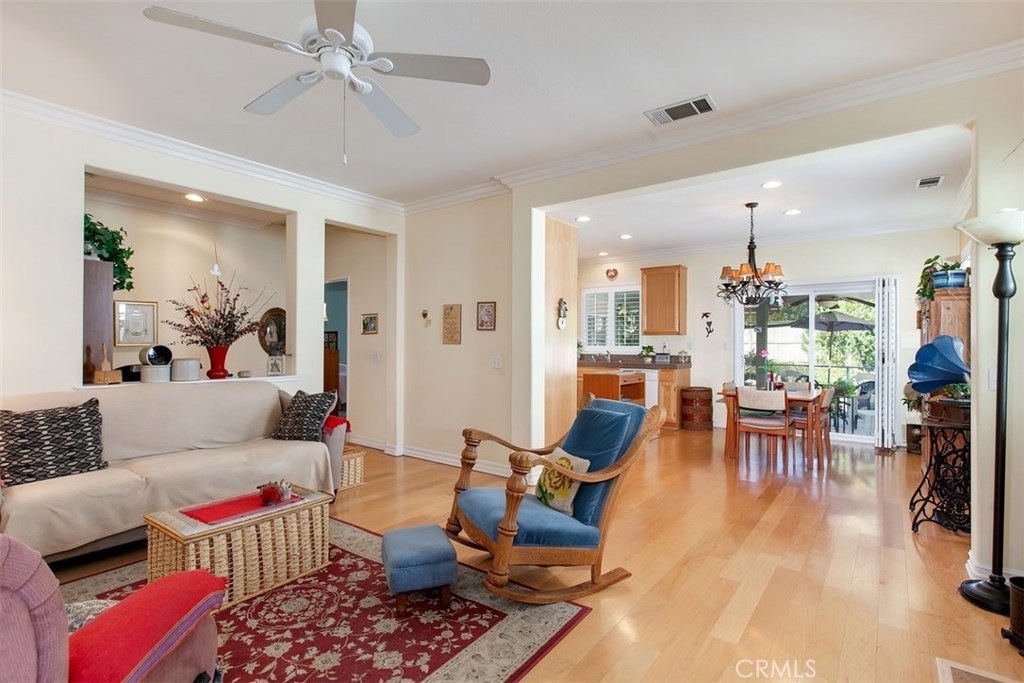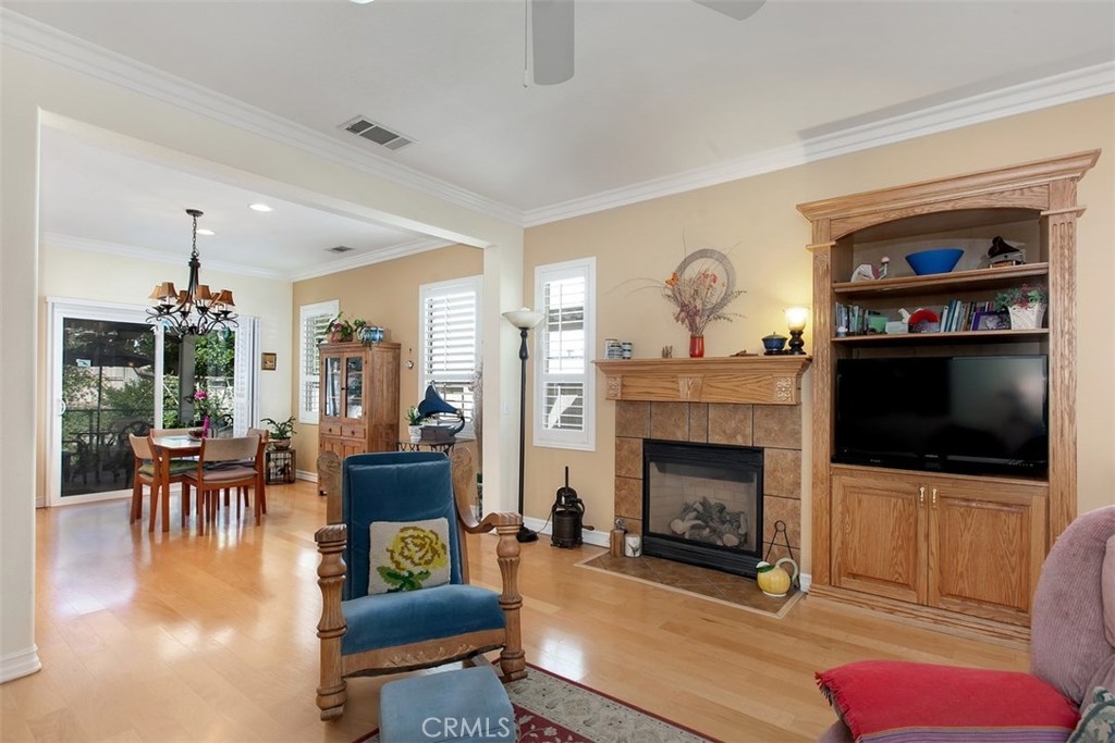 This adorable 2-bedroom 2 bath home has lovely wood floors throughout the main living areas. Enjoy entertaining in this very open living room with a cozy fireplace featuring tile details and lovely mantle that opens to the roomy dining area. The kitchen is bright and airy and looks out at the attractive rear yard with a very spacious covered patio. The master suite has a fantastic walk in closet with a walk-in bath/shower and convenient dual sinks. The master bedroom has a ceiling fan and an attached retreat or patio room. The guest bedroom has a beautiful frosted glass French door with a glass transom window, and convenient guest bath. There is a handy office nook between the master suite and the indoor laundry room. Lots of storage in the laundry too. This home features lovely neutral colors throughout, elegant crown molding, oversized baseboards, plantation shutters and ceiling fans. Appreciate the warm summer evenings under the alumawood covered patio overlooking the sizable rear yard with lovely drought tolerant landscaping, plus there is a handy garden shed. The two-car garage has lots of built in storage cabinets plus an exterior door to the side yard. This is a great home in a great location in the exclusive Oasis.