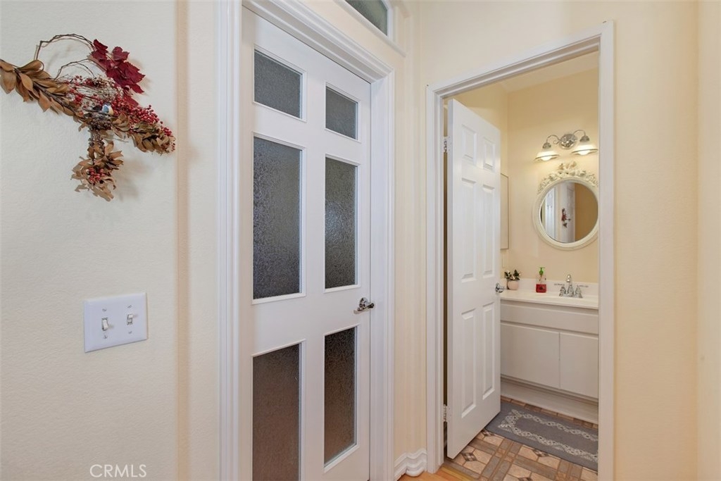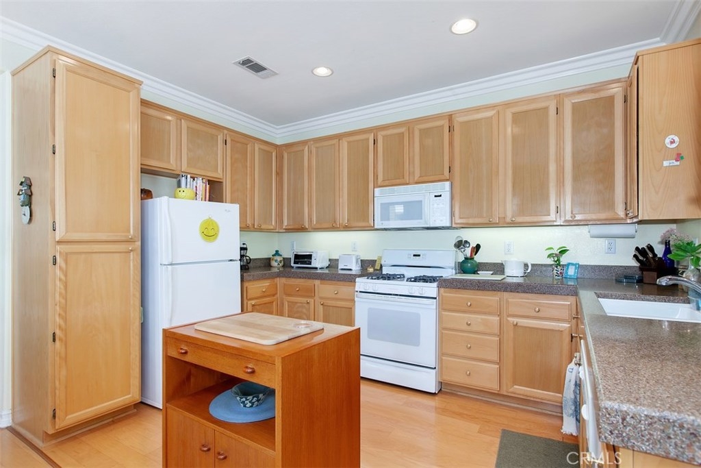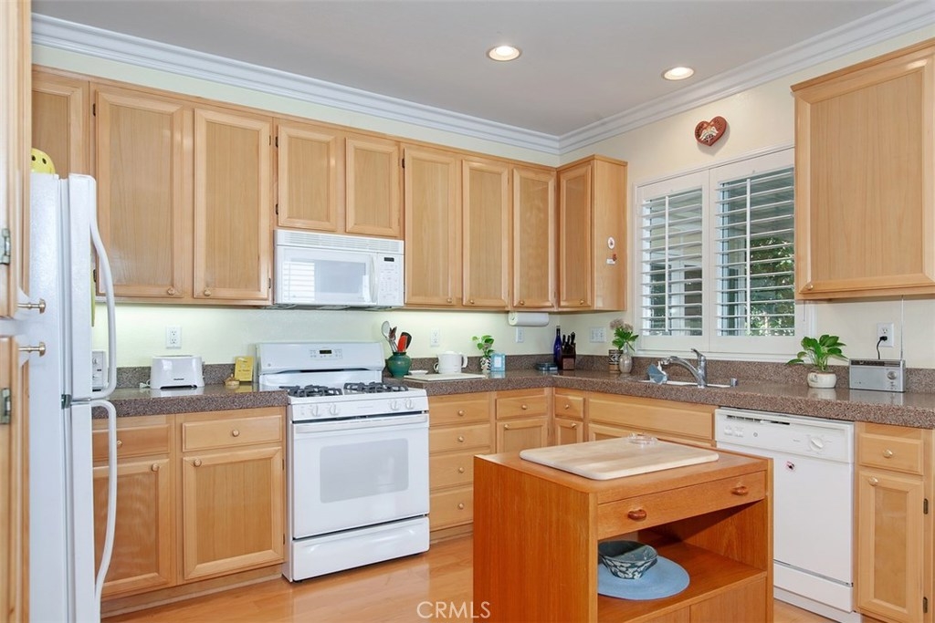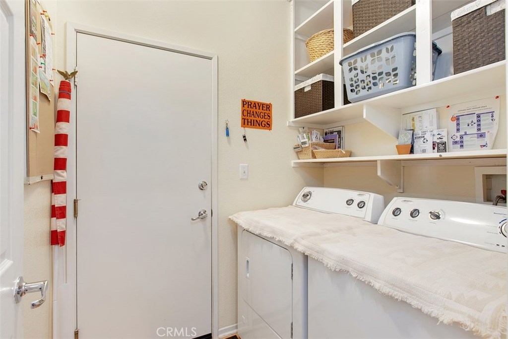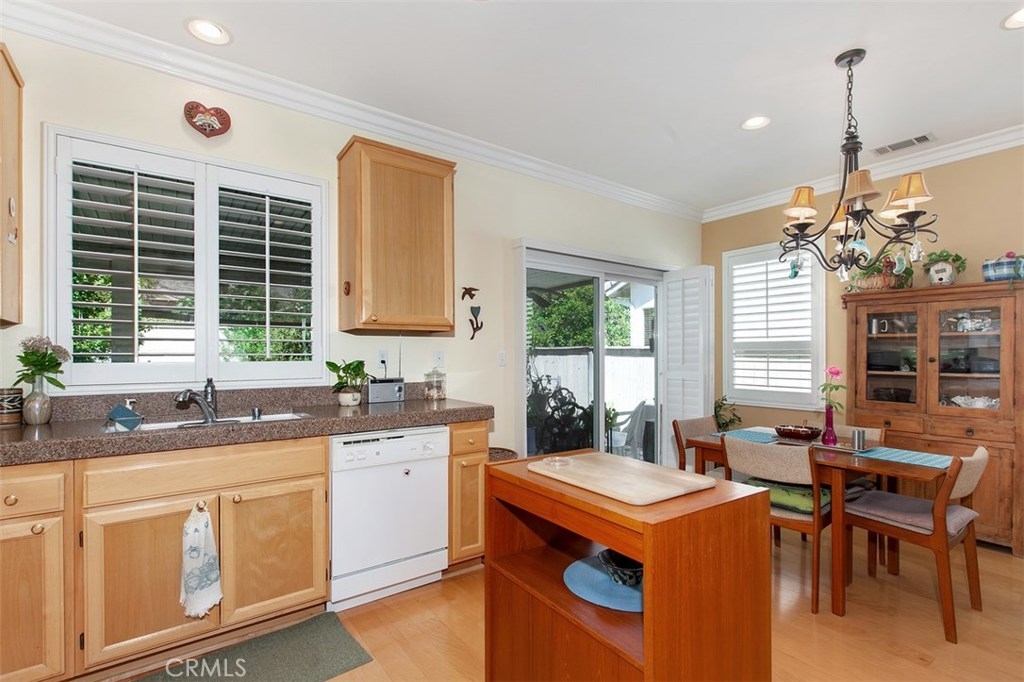 This adorable 2-bedroom 2 bath home has lovely wood floors throughout the main living areas. Enjoy entertaining in this very open living room with a cozy fireplace featuring tile details and lovely mantle that opens to the roomy dining area. The kitchen is bright and airy and looks out at the attractive rear yard with a very spacious covered patio. The master suite has a fantastic walk in closet with a walk-in bath/shower and convenient dual sinks. The master bedroom has a ceiling fan and an attached retreat or patio room. The guest bedroom has a beautiful frosted glass French door with a glass transom window, and convenient guest bath. There is a handy office nook between the master suite and the indoor laundry room. Lots of storage in the laundry too. This home features lovely neutral colors throughout, elegant crown molding, oversized baseboards, plantation shutters and ceiling fans. Appreciate the warm summer evenings under the alumawood covered patio overlooking the sizable rear yard with lovely drought tolerant landscaping, plus there is a handy garden shed. The two-car garage has lots of built in storage cabinets plus an exterior door to the side yard. This is a great home in a great location in the exclusive Oasis.