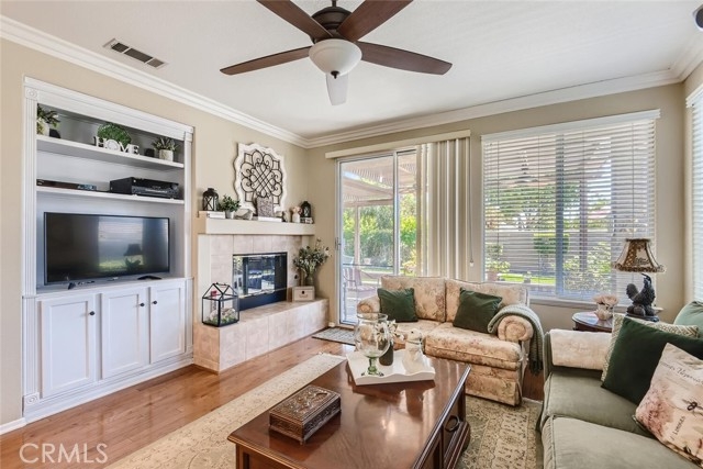Fabulous highly upgraded and customized home at a premier "Over 55" gate guarded golf resort on an incredible 8,276 sq. ft. very private corner lot with multiple covered patios with ceiling fans, manicured lawns and lush gardens. Great curb appeal with a big covered front porch. Beautiful hardwood floors through the entry, kitchen, dinette and family room. Custom paint throughout. Crown moldings in the living room, dining room, kitchen, family room and dinette. The living/dining room is also usable as a great room or recreation center and features a plantation shutter separation to the kitchen and family room. Stunning kitchen with quartz counters, custom tile backsplashes and stainless steel appliances. The island has a stainless steel double sink, dishwasher and breakfast bar. Walk-in pantry and dinette. Family room with built-in entertainment center with cabinets and shelves, TV niche, raised hearth tile fireplace and slider to the patios and huge rear yard. The elegant master suite features 10 foot ceilings and ceiling fan. Master bath with tile floors, dual sink vanity, big shower, private commode area and large walk-in closet with mirrored doors. One of the guest bedrooms is currently being used as an office and has a double door entry, ceiling fan, crown moldings, chair rails and walk-in closet. The other guest bedroom also has a ceiling fan and chair rails. Guest bathroom with diagonal tile floors, wainscoting, tub with shower over and solar tube lighting. The laundry also features diagonal tile floors, a solar tube, cabinets galore, folding table and hook-up for a gas or electric dryer. The epoxy floor oversized garage can accommodate 2-cars or pick-up trucks plus golf carts and has a workbench and plenty of storage cabinets. Extraordinary community amenities including a 22,000 sq. ft. clubhouse with an immense auditorium, commercial kitchen, media/card room, state-of-the art fitness center, library, computer center and billiard parlor. There are two night lighted tennis courts and four pickleball courts. BBQ /party area set against a lovely mountain backdrop, tropical pool, spa, bocce ball, horseshoes and much, much more. This community is ideally located about an hour's drive to L.A. and Orange Counties, Idyllwild, downtown San Diego and Palm Springs. Close to the Temecula Wine Country and Casinos.