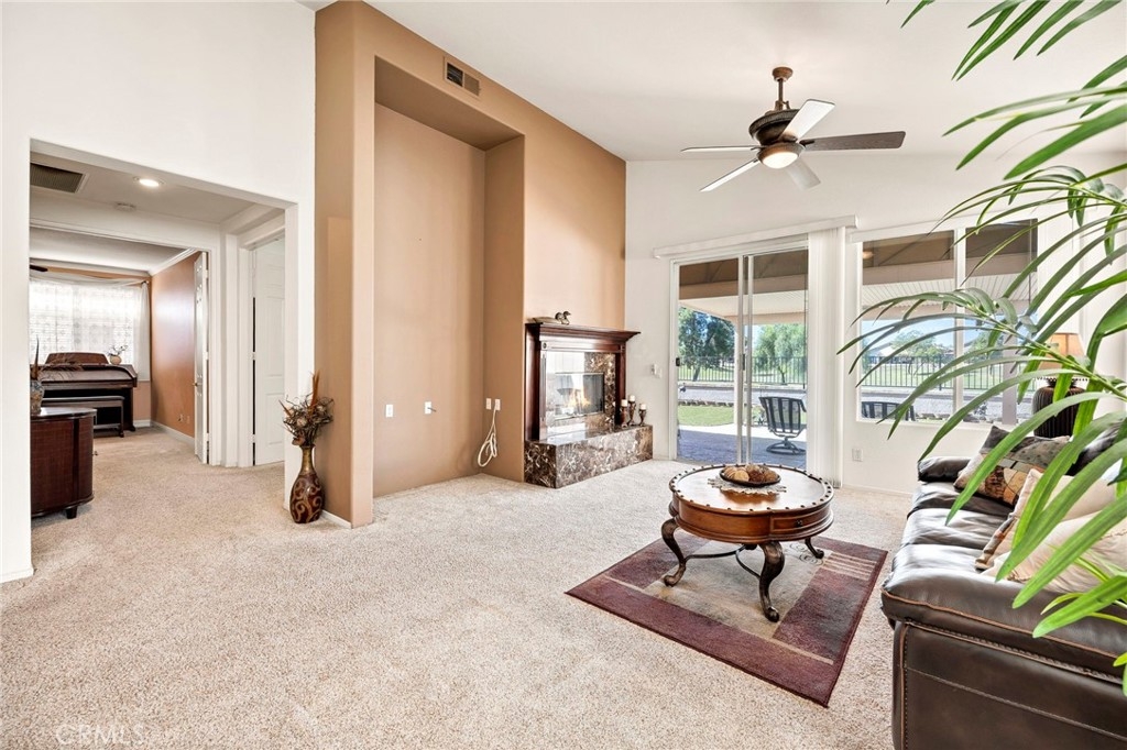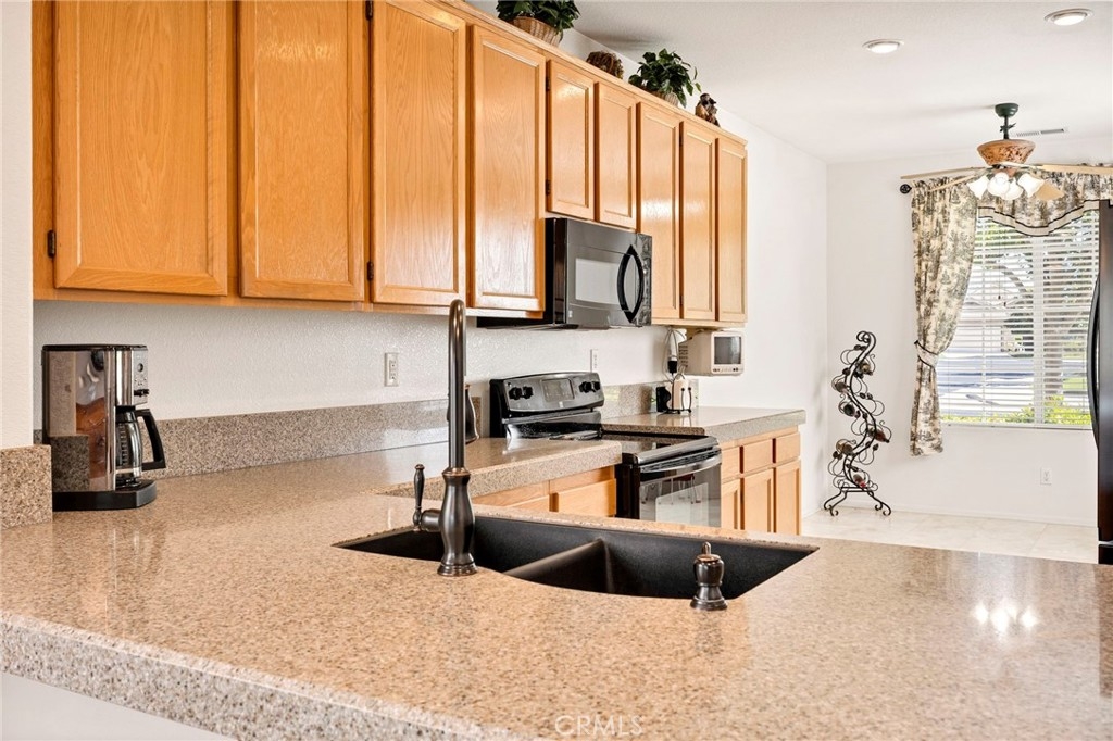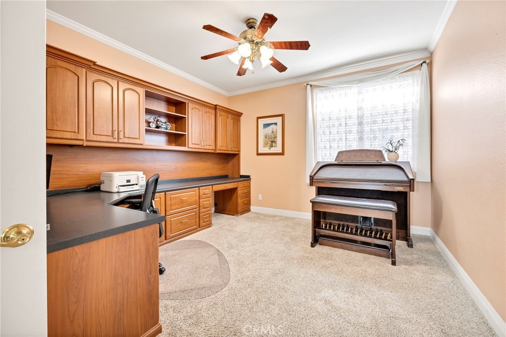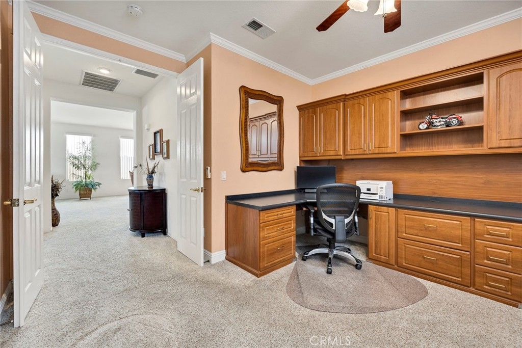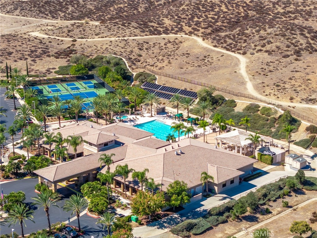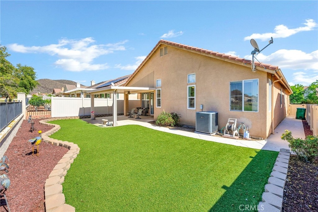 This beautifully maintained single-story home is located directly on the Golf Course in the highly sought-after 55+ Resort-Style Community known as “The Oasis”. This all-electric, energy-efficient residence combines comfort and functionality with a pre-paid leased solar system, newer air conditioning installed in 2018, and a Quiet-Cool whole-house fan for maximum energy efficiency. Inside, you’ll find tall ceilings, crown molding, sun-screens, and ceiling fans throughout, creating a bright and comfortable living space. The open-concept layout features a spacious Great Room with a tile fireplace and built-in office area, ideal for working from home or managing hobbies. The Home Office could also be used as a 3rd Bedroom if needed. The eat-in kitchen offers ample cabinetry, generous counter space, and an inviting casual dining area perfect for everyday meals. The Master Bedroom suite provides a peaceful retreat with a large walk-in closet and an upgraded walk-in soaking tub installed in December 2023. The laundry room includes tile flooring, a utility sink, and extra storage. Step outside to enjoy low-maintenance landscaping with artificial turf, stamped concrete, and an alumawood patio cover with ceiling fan, overlooking the lush golf course with gorgeous mountain views. Additional highlights include an insulated garage door with built-in cabinets, a water softener, and a water heater blanket. The Guard-Gated community of Oasis offers resort-style amenities including a 22,000 sq. ft. clubhouse, pool, spa, fitness center, pickleball courts, bocce ball and a full schedule of social events and activities! The monthly HOA includes front yard maintenance and landscaping, water and trash service. The Oasis is conveniently located near shopping, dining, medical facilities, freeway access and just a short drive to the well-known Temecula Valley Wineries and Southern California Beaches, Desert, and Mountain destinations. This property truly offers it all…style, location, community amenities and functionality!